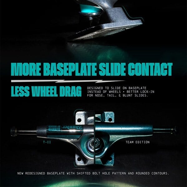 THUNDERトラックの弱点であった、スライド時にウィールが当たるといった部分をベースプレートを再デザインする事で改善。