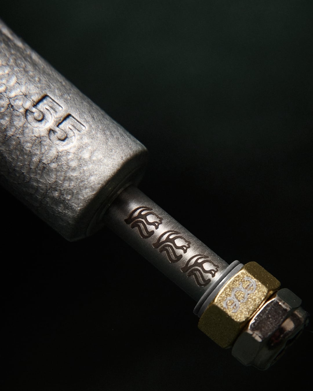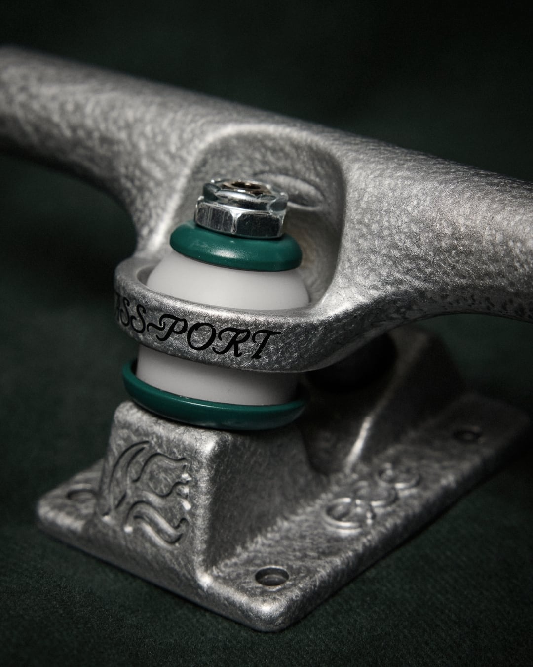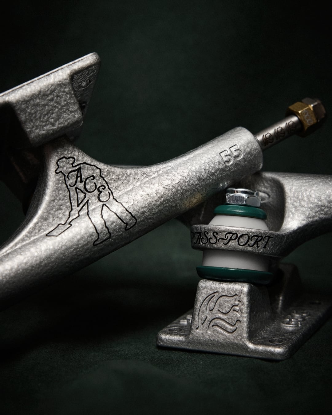 エース&スペードエンブレム、ティールグリーンのワッシャー、レーザーエッチング・エンボス加工・彫刻デザインを施し、フルハンマートーンカラーで仕上げ。クラシックなトラックにPass~Portならではの捻りを加えた逸品。