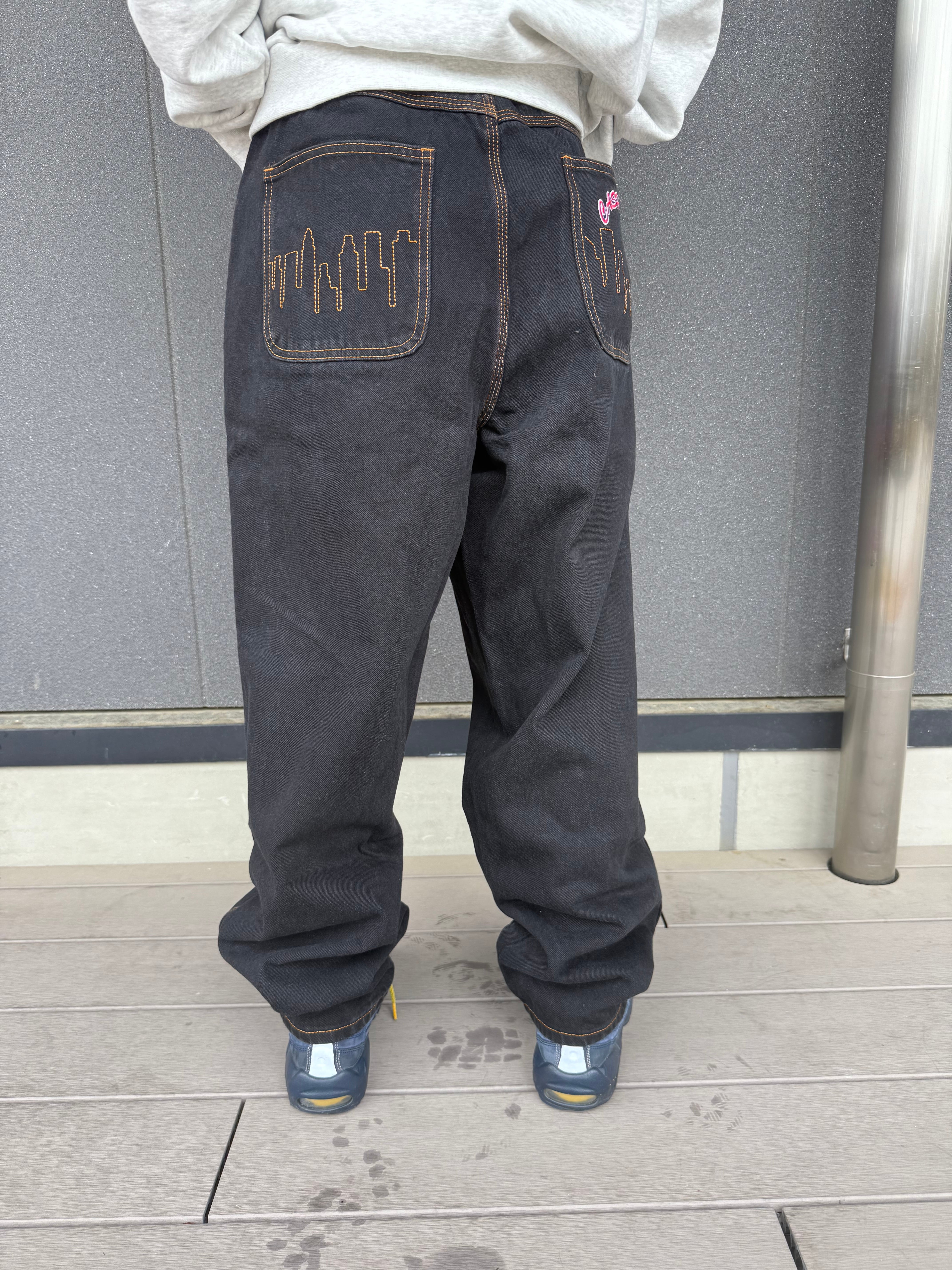 Baggy Denim Jeans With Slight Taper, Contrast Gold Stitching, Embroidered Logo On Front Coin Pocket, Embroidery Across Back Pockets, Brass Logo Button With Zip Fly Closure, Internal Drawstring, PU Label On Back Waistband.