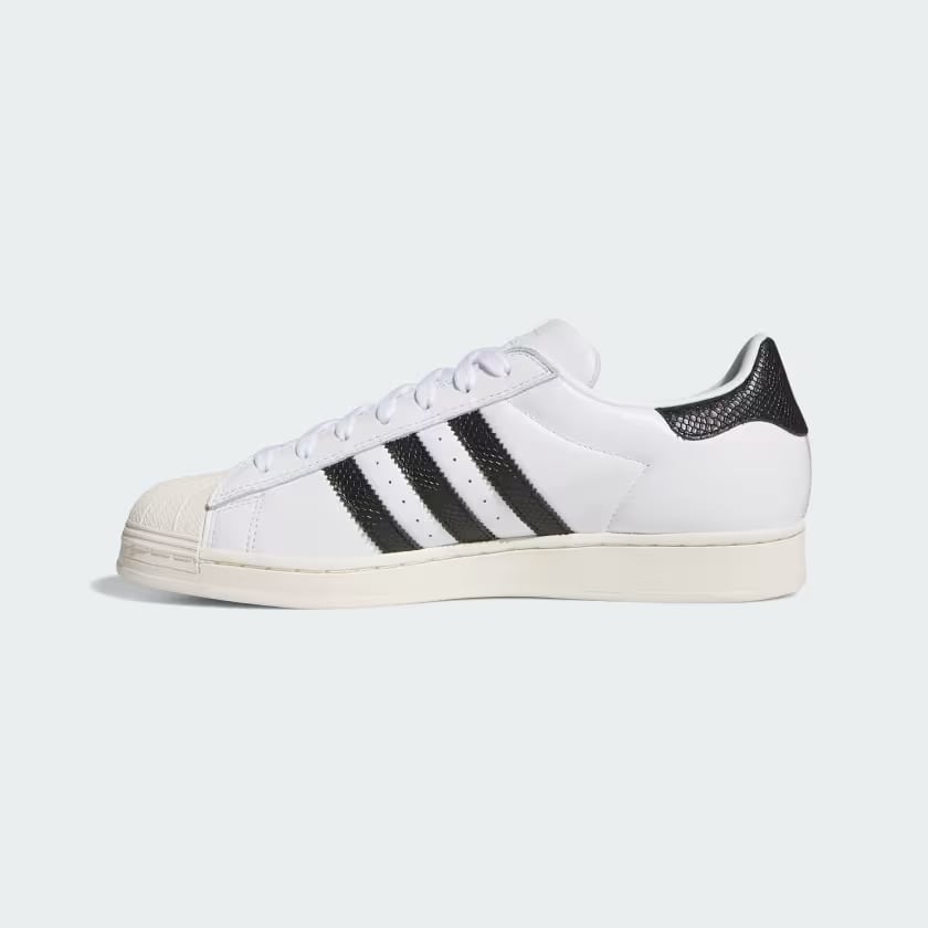 視覚的な中心となるのはアッパー全体を包む滑らかなホワイトのレザー素材です。この天然皮革は落ち着いた光沢を放ちながらも触れればしなやかな質感を感じさせます。側面に配置されたスリーストライプスには爬虫類の鱗のような凹凸を刻んだスネークスキン風の型押しレザーを採用しています。黒いラインの一本一本に刻まれた細かな溝が平面的なデザインに奥行きを与え見る角度によって複雑な陰影を落とします。